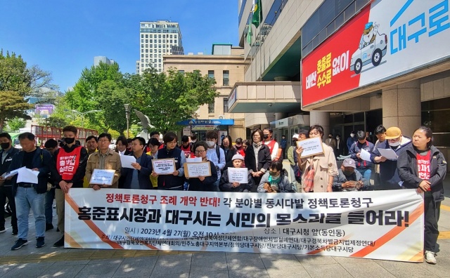 대구시민단체연대회의와 민주노총대구지역본부, 정의당 대구시당 등 대구지역 10개 시민단체·정당은 27일 대구시청 동인청사 앞에서 기자회견을 열고 "정책토론청구 조례 개악을 반대한다"고 밝혔다.