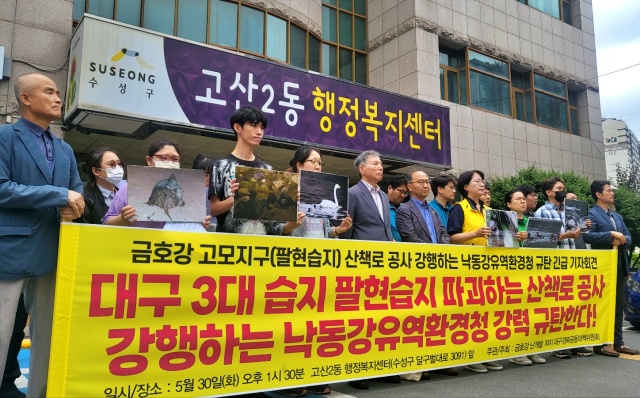 '금호강 난개발 저지 대구경북공동대책위원회'는 고산2동 행정복지센터 앞에서 기자회견을 열고 "금호강 고모지구 팔현습지 공사를 강행해 환경을 훼손하는 낙동강유역환경을 규탄한다"고 밝혔다. 대책위는 "멸종위기종 보금자리에서 공사를 강행하면 환경파괴는 불보듯 뻔하다"며 "해당 지역은 파크골프장이 들어서 이미 난개발로 고통 받고 있다. 목적 불분명한 사업을 중단하라"고 촉구했다.