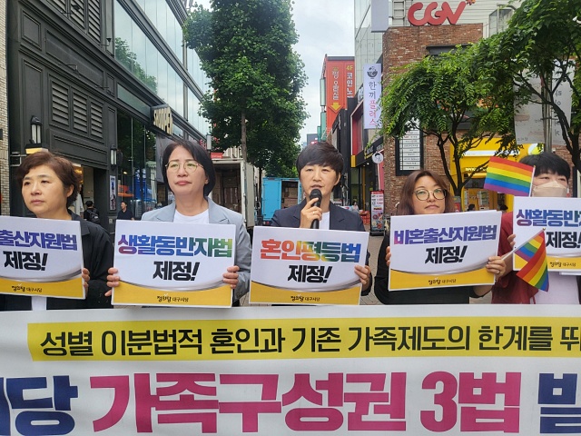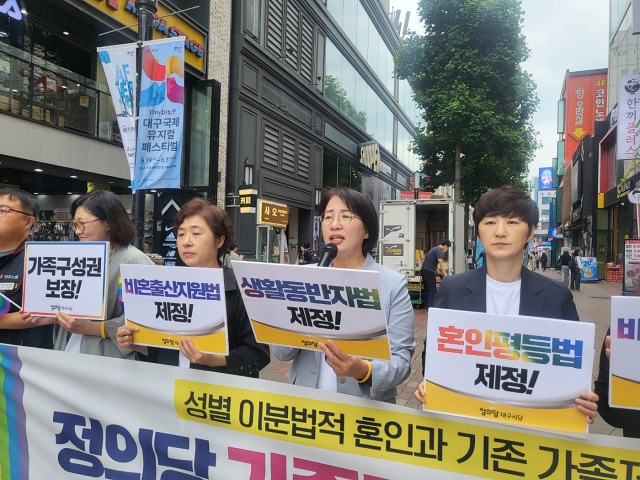 정의당 대구시당은 "한국에는 이미 다양한 형태의 가족이 존재하지만 법이 가족으로 인정하지 않아 법적 권리를 보장받지 못한다"며 "사회 안전망에서 배제된 채 불안정한 삶을 살아간다"고 주장했다.