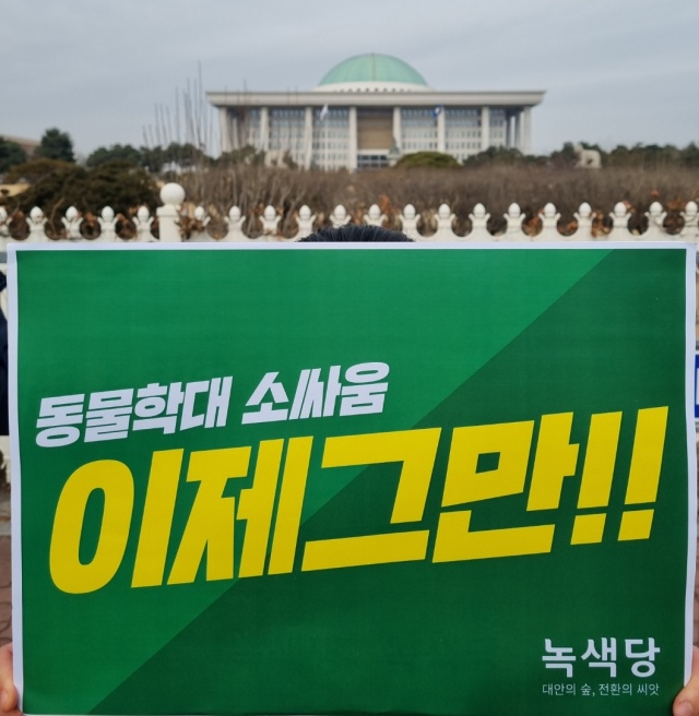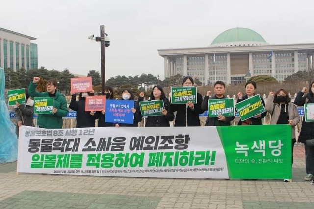 때문에 "▲경기 재개 중단 ▲소싸움 경기장 완전 폐쇄 ▲예산 편성 철회"를 촉구했다. ▲법 개정도 요구했다. '전통소싸움경기에 관한 법률'상 소싸움은 '민속경기'로 합법적이다. '동물보호법'은 도박과 유흥 목적으로 동물에게 상해 입히는 행위를 금지하고 있지만 '민속경기는 제외한다'는 예외 조항을 둬 법적으로 막을 근거가 없다. 때문에 녹색당은 7글자를 삭제하는 동물보호법 개정을 요구했다.