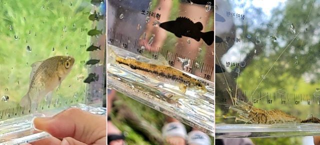 ▲ 금호강에서 만난 토종 붕어, 돌마자, 징거미새우(2023.6.5) / 사진.평화뉴스 김영화 기자