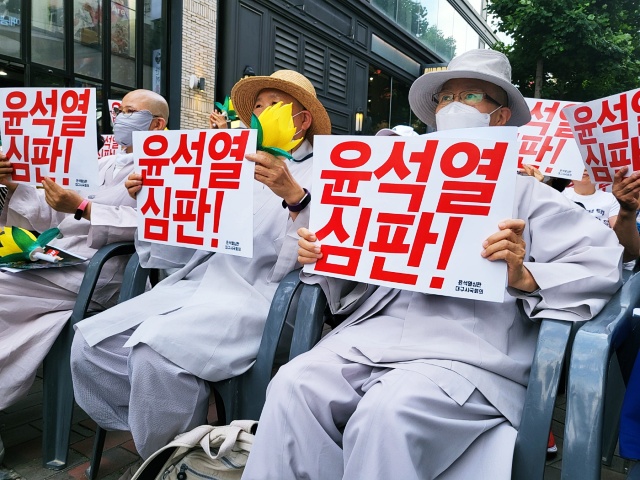 스님들이 윤석열 대통령을 향해 죽비(불교에서 수행자를 지도할 때 쓰는 도구)를 들었다. 스님들은 수시로 죽비를 내려치며 윤석열 대통령의 '민생 파괴', '굴욕 외교', '민중 탄압' 정책을 규탄했다.