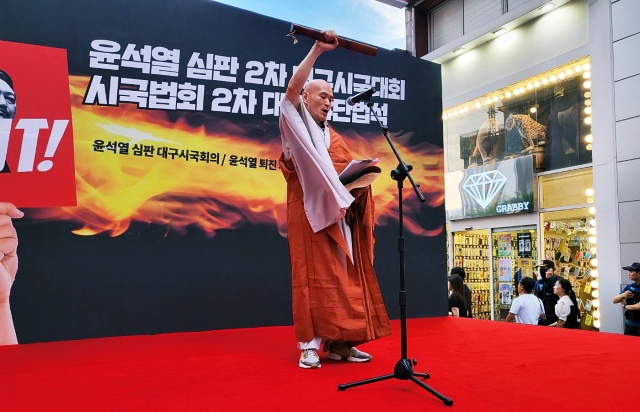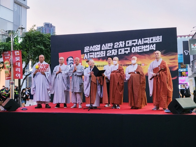 '윤석열 심판 대구시국회의'와 '윤석열 퇴진 시국법회 야단법석'은 24일 오후 동성로 CGV 대구한일 극장 앞에서 '윤석열 심판 2차 대구시국대회'와 '시국법회 2차 대구 야단법석'을 열고 "윤석열 대통령 퇴진"을 촉구했다. 조계종 스님들과 대구시민 등 300여명이 참석했으며 2시간 넘게 진행됐다.