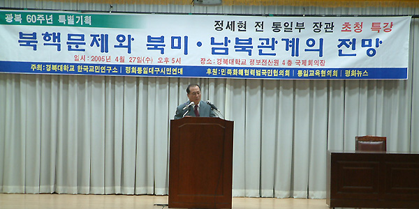 정세현 전 통일부장관은 오늘(4.27) 오후 경북대에서 '북핵문제와 북미.남북관계의 전망'이란 주제로 열린 특강에서 이같이 말하고, "미국의 이런 일방주의 정책을 바꾸도록 우리 정부와 여야가 한목소리로 요구해야 한다"고 강조했다.