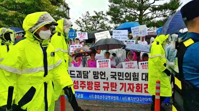 사드철회 성주대책위원회와 사드배치반대 김천시민대책위원회는 이날 성주군청 앞에서 기자회견을 열고 "사드 자체가 괴담"이라며 "불법적으로 배치한 사드를 철거하라"고 촉구했다.