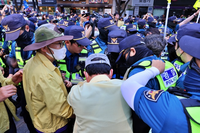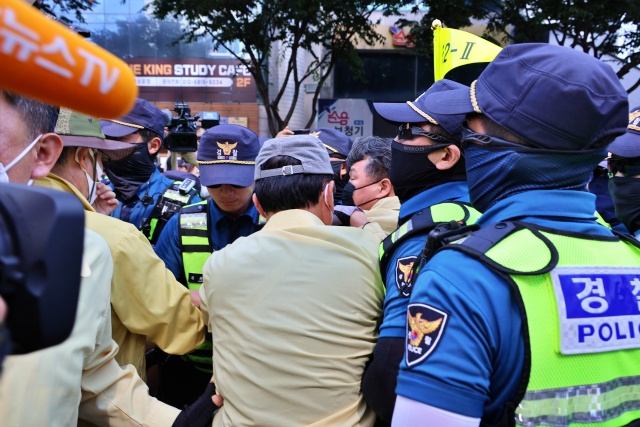 ▲ 퀴어축제 행정대집행에 들어간 대구시 공무원들과 대구경찰이 충돌했다.(2023.6.17) / 사진.평화뉴스 김영화 기자