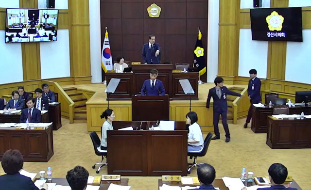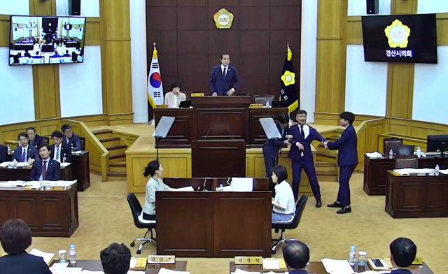 제9대 경산시의회 국민의힘 소속 박순득(58.다선거구) 의장이 손짓했다. '5분 자유 발언' 중인 더불어민주당 이경원(47.라선거구) 경산시의원은 사무처 직원들에 의해 단상에서 끌려나갔다.