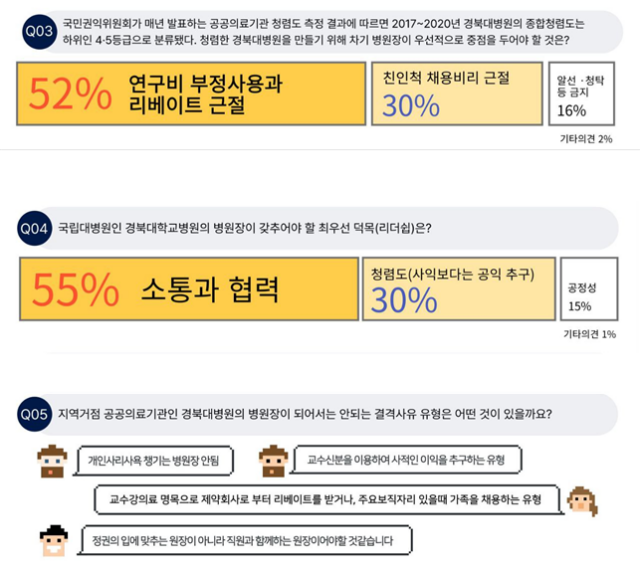 경북대병원장이 갖출 최우선 덕목은 55%(579명)가 '소통과 협력'을 꼽았고, 30%(311명)는 '사익보다 공익을 추구하는 청렴도', 15%(154명)는 '공정성'을 선택했다.