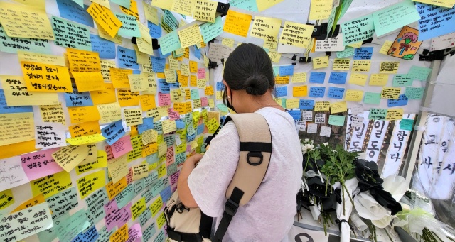 ▲ 대구 한 중학생이 숨진 서이초 교사의 명복을 비는 포스트잇을 썼다.(2023.7.24) / 사진.평화뉴스 김영화 기자