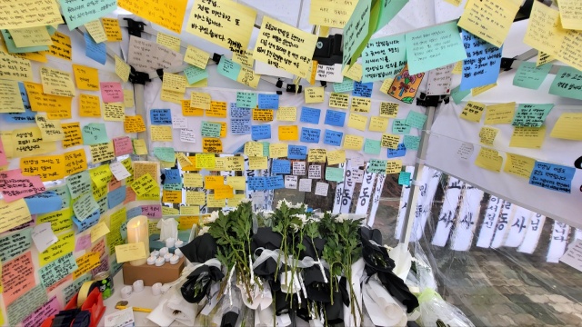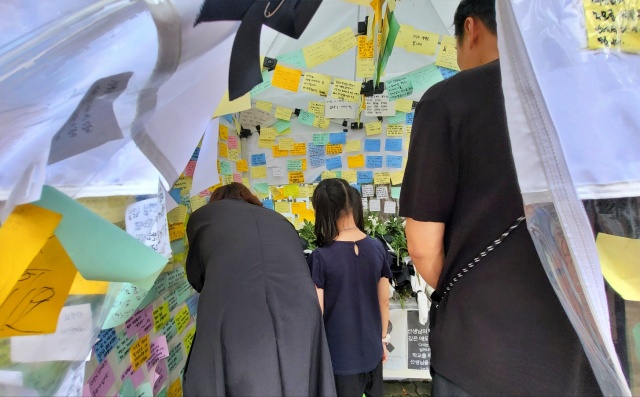 ▲ 수백장의 포스트잇과 국화꽃(2023.7.24) / 사진.평화뉴스 김영화 기자