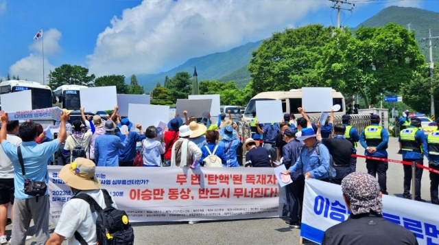 시민단체는 제막식 행사장 앞에서 거세게 반발했다.