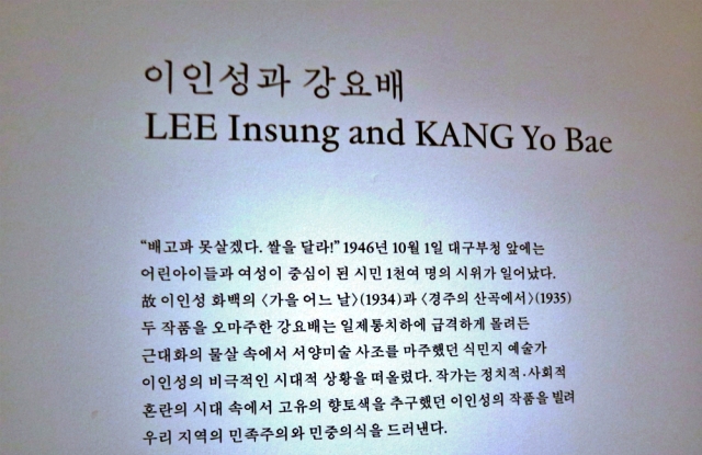 특히 이인성 화가의 이력에 대해 "대구 수창공립보통학교를 졸업하고 서동진이 운영하는 '대구미술사‘에 일하다 일본 태평양미술학교에서 수학한 뒤 조선총독부 문화정치 일환인 '조선미술전람회'에 14회 연속 참여해 총독부상을 포함한 다수의 상을 받아 명성을 쌓았다"고 했다. 이어 "식민지 현실 모순을 외면하고 모더니스트로 식민체제에 순응한 미술가"라고 평가했다.