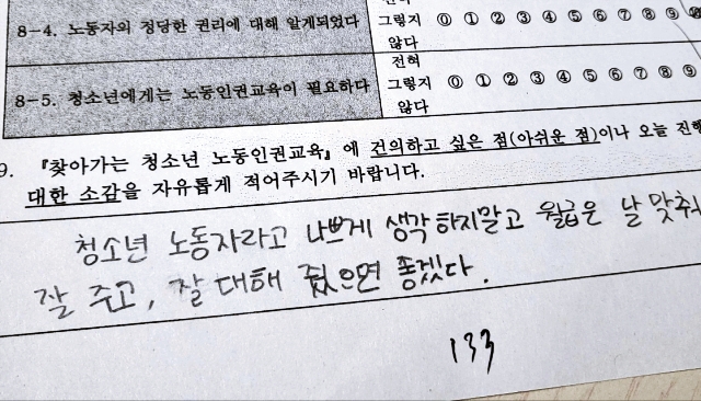 "청소년 노동자라고 나쁘게 생각하지 말고, 월급은 날 맞춰서 잘 주고, 잘 대해줬으면 좋겠다"