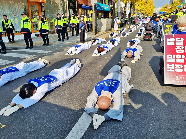 함께하는장애인부모회와 전국장애인부모연대 대구지부, 대구장애인차별철폐연대는 23일 대구시청 동인청사 앞에서 발달장애인의 권리 보장을 촉구했다. 기자회견 이후 동인청사 앞에서 시작해 공평네거리와 봉산육거리를 거쳐 반월당역까지 1.3km 거리를 오체투지하며 행진했다.