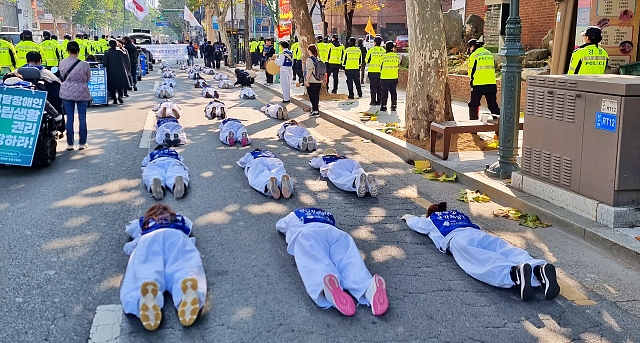 이들 단체는 "발달장애인 가족 참사를 멈추라고 아스팔트 위에 오체투지로 몸을 내던진다"며 "'아이 때문에 얼마나 힘드냐' 이런 이야기를 듣지 않아도 되는 사회, 시설에 보내지 않아도 지역사회에 잘 살 수 있는 사회, 내가 죽어도 나의 자녀가 안전하게 살아갈 사회를 만들어 달라"고 촉구했다.