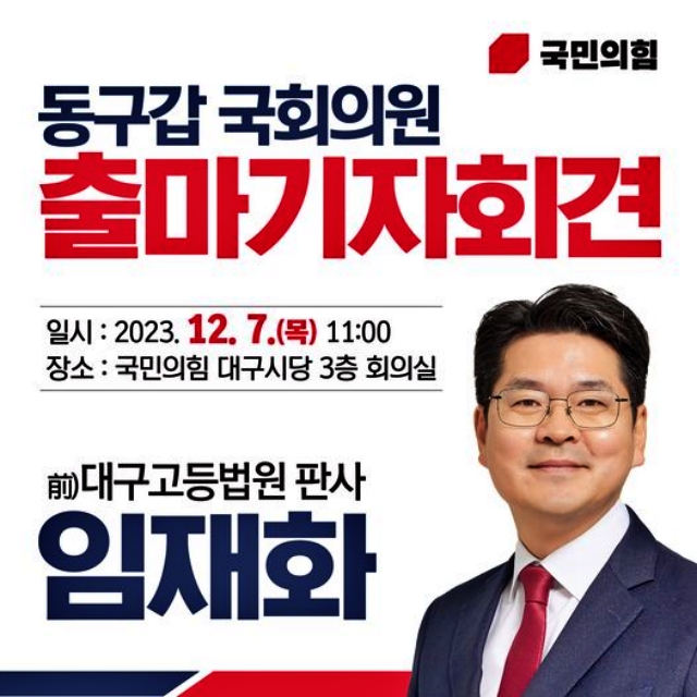 ◆ '동구갑'에서는 임재화(52) 전 대구고등법원 판사가 7일 오전 국민의힘 대구시당에서 기자회견을 열고 출마를 선언했다. 임 전 판사는 "국회의원의 존재감이 전혀 없는 지역의 사정을 바꿔야하겠다는 마음으로 출마를 결심했다"면서 "정체된 동구를 발전시키고 정치개혁을 이루겠다"고 다짐했다. 이 지역구 현역인 재선의 류성걸 의원과 당내 경쟁이 예상된다.