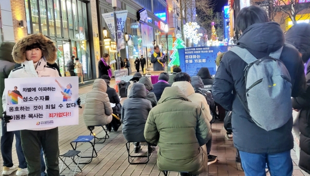 대구경북 목회자정의평화협의회와 대구 NCC 인권위원회, 정의당 대구시당 성소수자위원회, 무지개인권연대는 17일 오후 대구 중구 동성로 CGV한일 앞에서 이 목사와 함께 연대하는 촛불 기도회를 열고"축복에는 성정체성 구분이 없다"며 "감리회는 부당한 출교 조치를 철회하라"고 촉구했다.