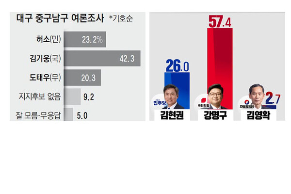 최근 실시된 여론조사를 보면, ▲대구 중구남구(매일신문 3.29~30. 중구남구 501명 조사)의 경우 김기웅 42.3%, 허소 23.2%, 도태우 20.3%로 집계됐다. '지지후보 없음' 9.2%과 '잘 모름·무응답' 5.0%를 합친 부동층은 14.2%였다.