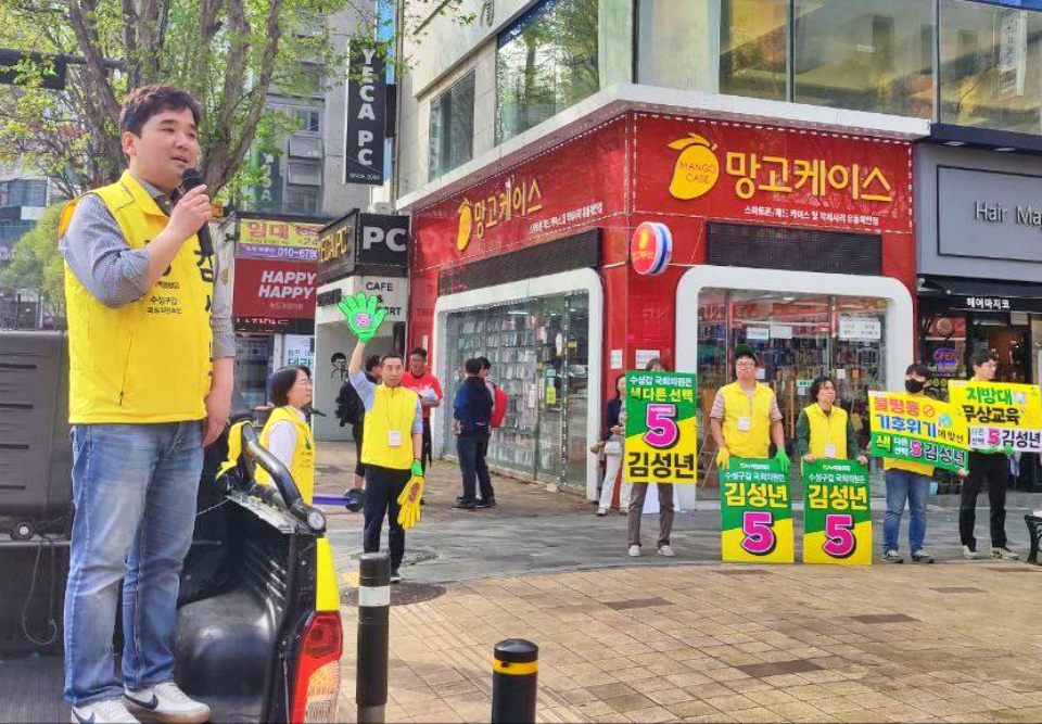 지지자들은 거리에서 "지방대 전면 무상교육 실시" 등 김 후보의 제22대 핵심 총선 공약이 담긴 피켓팅도 했다. 선거 차량에는 '불평등과 기후위기에 맞선 색다른 선택'이라고 적어 녹색정의당의 총선 슬로건을 강조했다. 노란색과 초록색, 녹색당과 정의당의 색깔을 하나로 섞은 '녹색정의당' 선거 차량에서 유세 발언도 이어졌다.