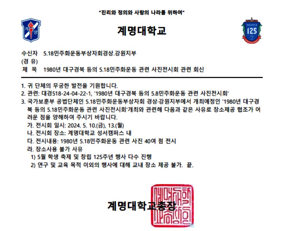 국가보훈부 공법단체 '5.18민주화운동부상자회 경상·강원지부'를 비롯한 '제44주년 대구 5.18민중항쟁 기념행사위원회'에 9일 확인한 결과, '1980년 대구경북 등의 5.18민주화운동 관련 사진전시회'와 관련해 계명대는 두 단체에 사용 불허를 통보했다.