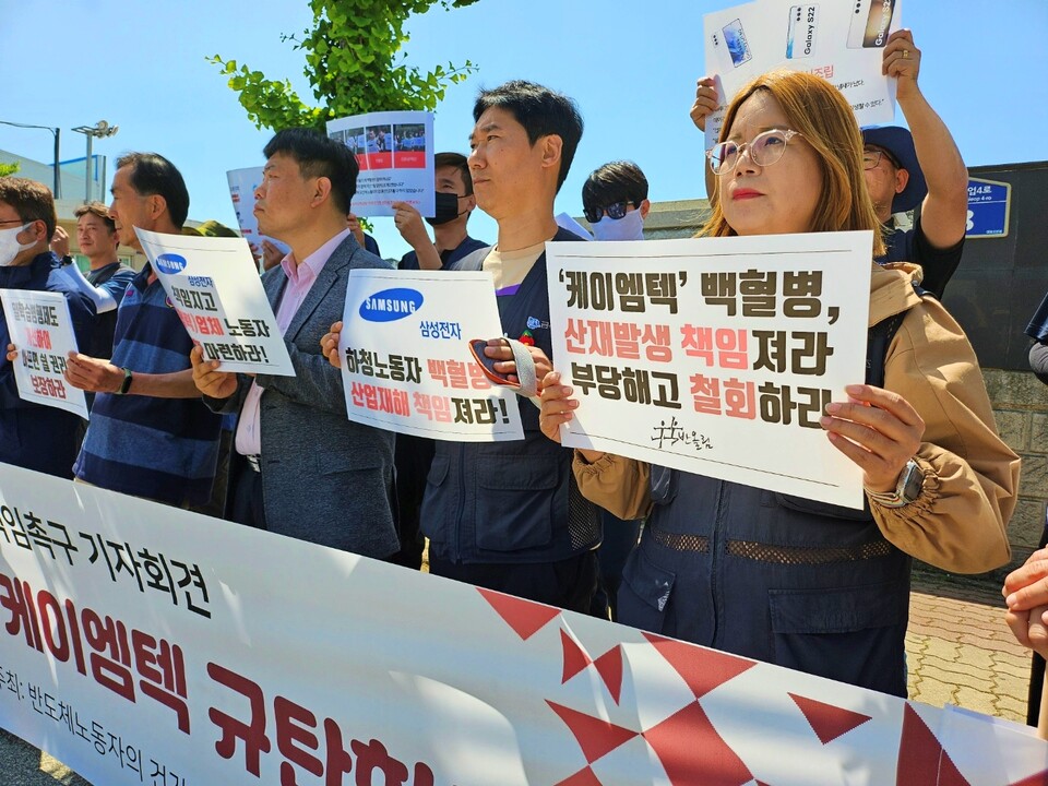 이들 단체는 "자라면서 잔병치레 하나 없이 건강했던 노동자가 이곳에서 일한 지 2년 만에 백혈병에 걸려 투병 중"이라며 "스물한 살 청년의 소중한 목숨과 삶의 희망마저 위협하는 무서운 병마를 안겨 준 사측에 제대로 책임을 묻기 위해 모였다"고 밝혔다.