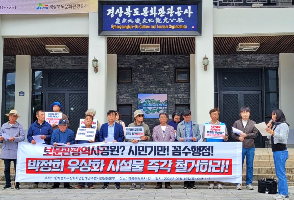 경주시민총회와 경주겨레하나, 민주노총경주지부, 경주환경운동연합, 민주당·진보당경주시지역위원회 등이 모인 '(가)박정희우상화사업반대경주범시민운동본부'는 16일 경북문화관광공사 앞에서 기자회견을 열고 "박정희와 박근혜 시설물 설치는 시민 기만, 꼼수 행정"이라며 "우상화 시설물들을 철거하라"고 촉구했다.