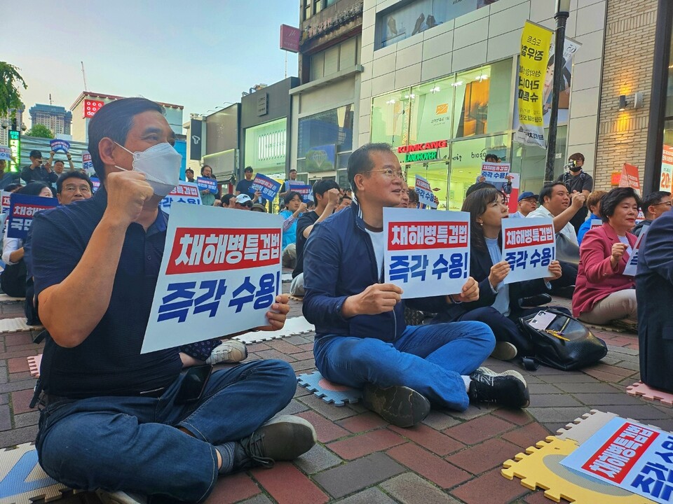 강민구 민주당 대구시당 위원장은 "윤석열 정부와 여당은 채 해병 순직과 관련해 현재까지도 무책임한 모습으로 일관하고 있다"며 "그 탓에 제대로 된 수사가 이뤄지지 않고 있다"고 비판했다. 그러면서 "진실을 밝히라는 국민 요구에 따라 대통령과 대통령실이 수사외압 의혹을 성역 없이 수사하기 위해서는 독립적이고 공정한 특검이 반드시 필요하다"고 강조했다.