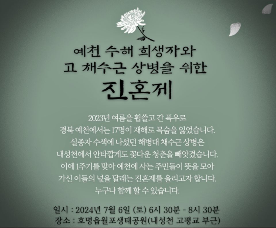 이들은 "1년전 여름을 흽쓴 재해로 17명이 목숨을 잃었고, 실종자 수색에 나선 채 상병도 내성천에서 안타깝게도 꽃다운 청춘을 빼앗겼다"며 "1주기를 맞아 예천에 사는 주민들이 뜻을 모아 가신 이들의 넋을 달래는 진혼제를 올리게 됐다"고 설명했다.