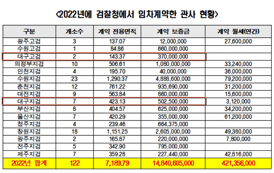 같은 해 임차한 관사 월세로만 연간 4억2,000만원을 사용한 것이다. 2022년 계약된 임차 관사는 각 지역 기과장을 제외하고 전체 73,413㎡를 사용하는 검찰청 관사 규모의 10%에도 못미치는 규모여서 전체 관사 규모로 계산하면 수천억대 매매금과 보증금에 수십억대 월세를 지급한다.