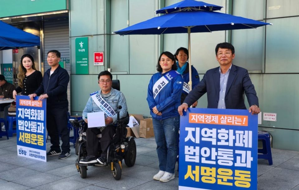 국회 행정안전위원회 소속 민주당 박정현(대전 대덕구) 국회의원은 지난 10월 15일 전국 지방자치단체들로부터 받은 '지역화폐 국비 투입 의견 조회 결과' 지자체 191곳 중 157곳이 "국비 지원이 필요하다는 회신을 했다"고 밝혔다. 민주당은 정부가 예산에 아예 손을 댈 수 없게 '지역화폐법' 재정을 추진하고 이다. 일부 민주당 의원들은 본인 지역구에서 '지역화폐법 재정'을 촉구하는 거리 서명운동을 벌이고 있다.