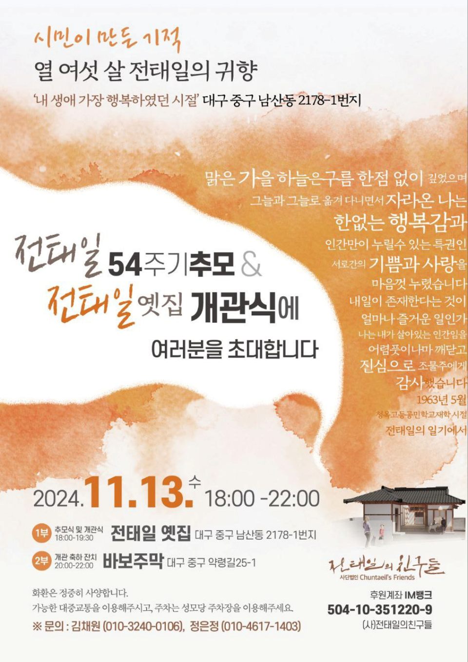 한편, 전태일 열사의 대구 옛집 복원과 관련한 후원이나, 행사와 관련한 자세한 사항은 (사)전태일의 친구들(김채원, 정은정) (→클릭) 홈페이지에 문의하거나 웹포스터에 적힌 전화번호로 문의하면 된다.