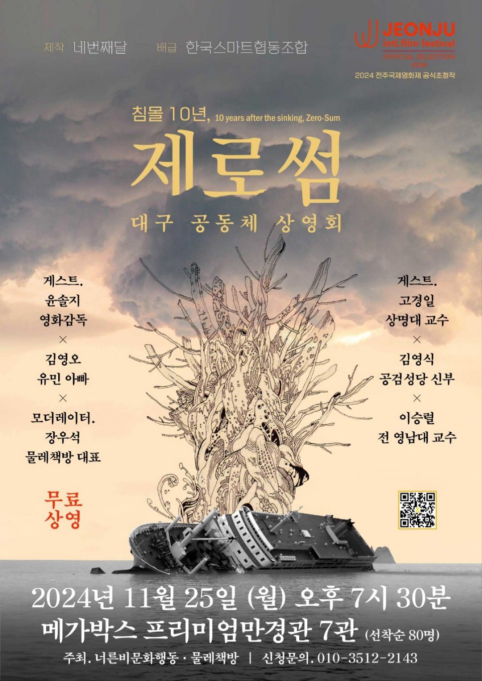 '너른비문화행동'과 '물레책방'은 25일 오후 7시 30분 대구시 중구 국채보상로 메가박스 프리미엄만경관 7관(선착순 80명)에서 다큐멘터리 영화 <침몰 10년, 제로썸> 대구 공동체 상영회를 연다고 밝혔다.