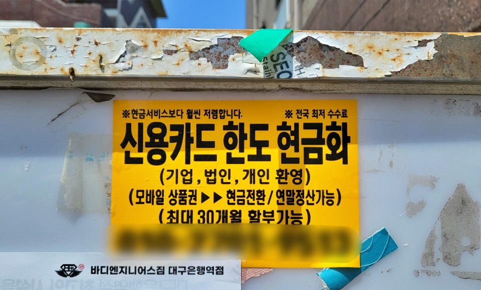 '임대', '부동산 문의' 등 플래카드 사이로 '저금리 바로대출', '신용카드 한도 현금화' 등 서민 직장인들과 자영업자들에게 저리로 돈을 빌려준다는 스티커들이 상가 벽면과 유리창마다 다닥다닥 붙어 있다.