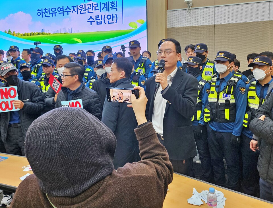 서해엽 환경부 수자원개발과장은 "정상적 공청회 진행에 협조해주길 바란다"며 "다른 지역 주민들도 많이 와 있기 때문에 공청회를 방해하지 말라"고 말했다.