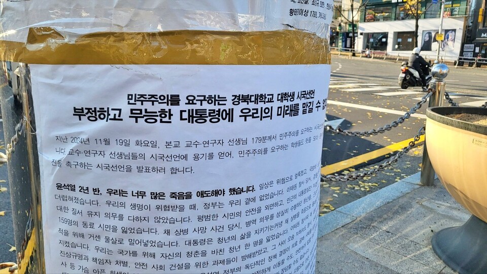 '민주주의를 수호하는 영남대학교 대학생 모임(준)'은 이날 인문관, 학생식당, 이과대학 도서관, 환경관 등에 같은 내용의 대자보를 게시했다. 글을 쓴 사람은 영남대 문화인류학과 신입생 24학번 반모(20)씨다.