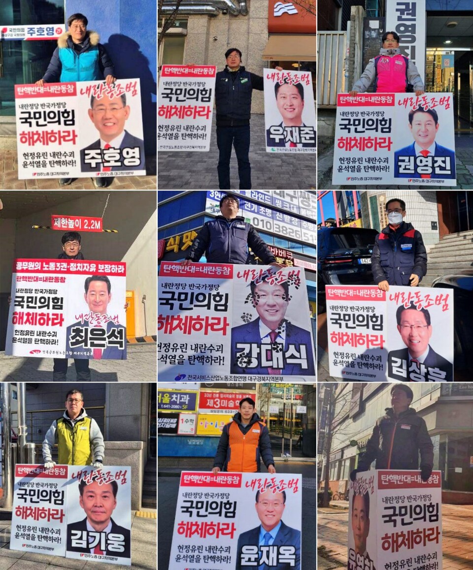 민주노총대구지역본부(본부장 이길우)는 지난 9일부터 12명의 대구 국회의원 지역사무실(전원 국민의힘) 앞에서 "탄핵반대는 내란동참, 내란정당, 반국가정당 국민의힘 해체" 촉구 1인 시위를 벌이고 있다.