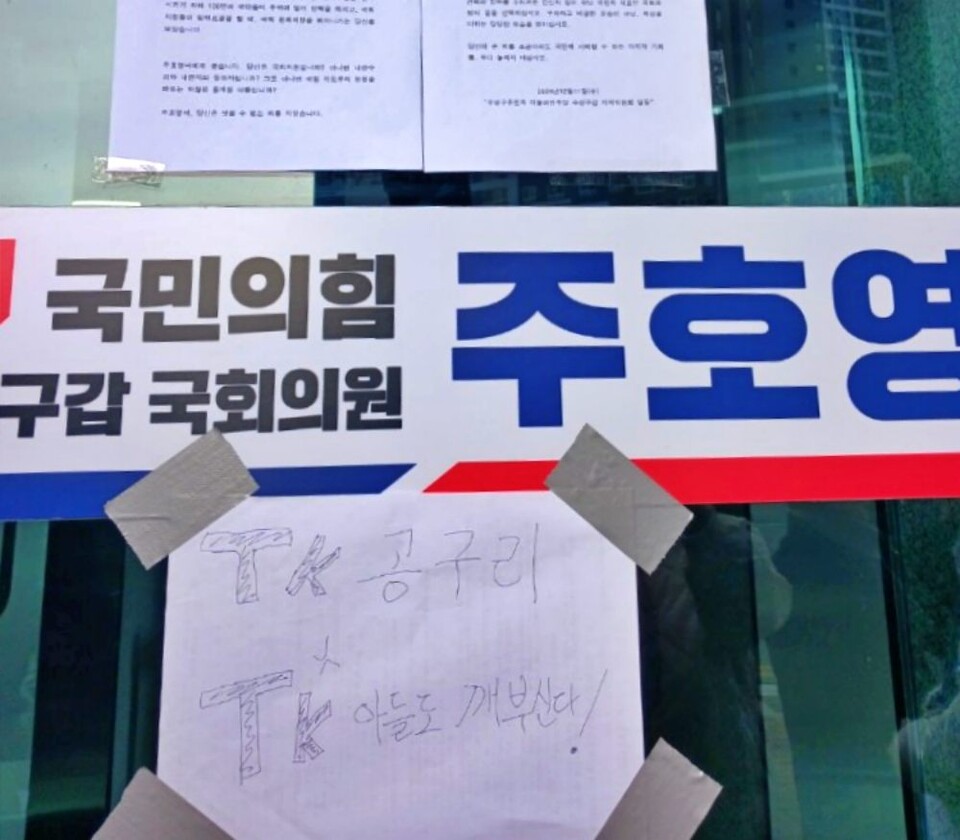 다른 의원들 지역사무실 앞에서도 항의가 빗발쳤다. 민주당 수성구갑지역위(위원장 강민구)는 11일 오후 국민의힘 수성구갑 주호영 의원 지역사무실 앞에서 기자회견을 열고 "헌법이 부여한 의무를 다하지 않고 권력과 안위를 누리려는 간신이 아닌 국민 대표의 길을 선택하라"며 "내란수괴에 동조한 당신의 죄를 조금이라도 사죄할 수 있는 마지막 기회가 오느 14일 탄핵안 표결에 동참하는 것"이라고 했다. 강 위원장은 주 의원 사무실 문에 "TK 공구리(콘크리트) TK 아들도 깨부신다"라고 적은 피켓을 붙였다.