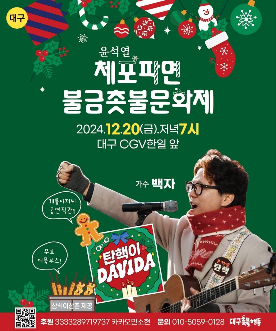 대구촛불행동은 오는 20일 금요일 오후 7시 동성로 CGV한일극장 앞에서 '윤석열 체포·파면 불금 촛불문화제'를 연다. 이들은 "윤석열 즉각 체포와 파면" 등을 촉구한다. '탄핵이 답이다' 캐롤 개사곡의 주인공인 가수 백자씨가 공연을 펼치고, 시민들의 자유발언이 이어진다.