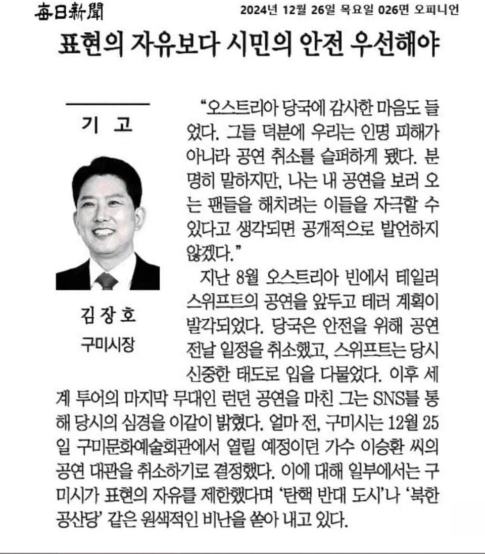 김 시장은 비판이 쏟아지자 이번엔 언론을 통해 항변했다. 그는 26일자 <매일신문> 기고를 통해 "표현의 자유를 제한했다며 원색적 비난이 쏟아지고 있지만, 표현의 자유보다 시민 안전을 우선해야 한다"며 "진영간의 첨예한 대립이 극에 달한 상황에서, 순수한 문화예술의 장으로 남기를 바라는 마음에서 화합을 도모할 서약을 요청했으나 거절당했다. 안전이 보장되지 않은 상태에서 공연을 강행하는 것은 위험하다"고 주장했다. 이어 "올해로 60세를 맞는 이승환씨의 연륜인데, 분열을 조장하는 모습은 대중 기억 속에 잊힐지 모른다는 자기 내면의 불안함을 표출하는 것"이라며 "측은한 마음이 들 뿐"이라고 비난했다.