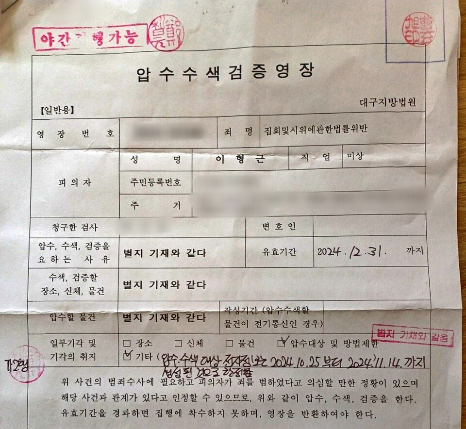 ◆ 경산경찰서는 이형근 영남대 민주동문회 회장에 대한 '집시법 위반' 혐의로 지난 26일 오전 이 회장 대구 자택과 차량, 휴대전화 등을 압수수색했다. 대구지검 공공수사부 박강일 검사가 영장을 청구해, 대구지법 정석원 영장전담 부장판사가 발부했다. '야간 압수수색 집행'이 가능한 영장이다.