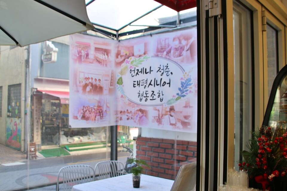 태평살롱에 손님이 앉을 수 있는 테이블은 딱 2개다. 테이블 옆 붉은 벽돌에 큰 현수막이 걸렸다. '언제나 청춘, 태평시니어협동조합' 슬로건이 적혔다. 슬로건과 함께 바리스타 자격증을 따고, 빵을 굽고, 카페를 오픈하던 어르신들의 지난 7년의 세월을 고스란히 담은 사진들도 보인다.