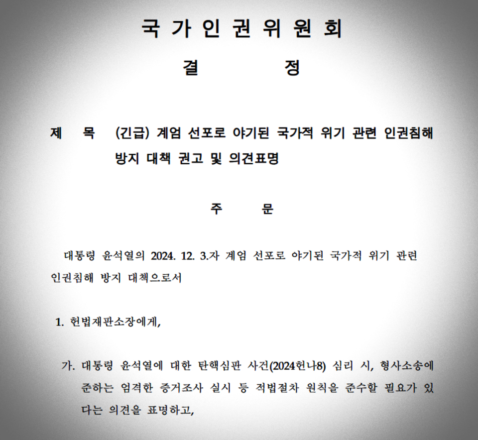 논란의 결정문은 '(긴급) 계엄 선포로 야기된 국가적 위기 관련 인권침해 방지 대책 권고 및 의견표명'이다. 인권위는 지난 10일 제2차 전원위원회에서 윤 대통령 방어권을 보장하는 취지의 결정문을 가결했다.