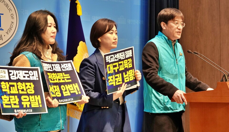 전교조 대구지부(지부장 김도형)는 27일 오전 국회 소통관에서 기자회견을 열고 "대구교육청이 학교의 AI디지털교과서 채택 과정에 개입해 교사 의견을 무시하고 교과서 도입을 강요했다"며 "위법적 판단에 따라 AI디지털교과서 도입을 강제했기 때문에 강은희 교육감을 직권남용 혐의로 고발한다"고 밝혔다.