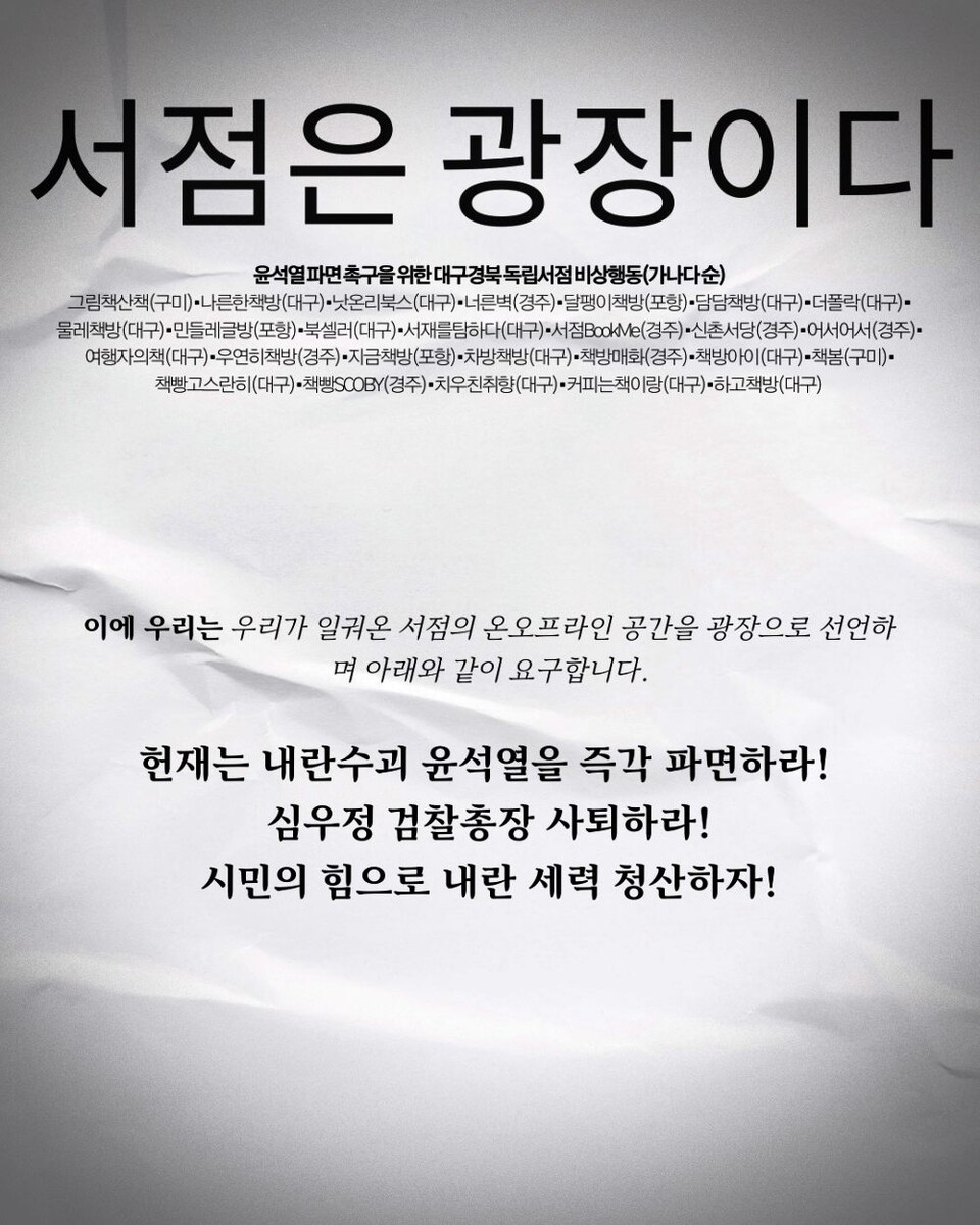 대구지역의 독립서점 더폴락, 물레책방, 책방아이, 책빵고스란히, 나른한책방을 비롯해 구미의 그림책산책, 경주의 너른벽, 우연히책방, 포항의 달팽이책방 등 지역의 작은 독립서점 26곳이 모인 '윤석열 파면 촉구를 위한 대구경북 독립서점 비상행동'은 13일 입장문을 내고 이 같이 요구했다.