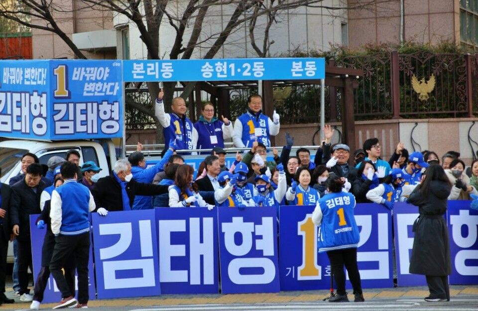 민주당 김태형 후보는 이번 재선거가 앞서 국민의힘 소속 전태선 의원의 '공직선거법 위반'으로 인한 당선무효로 치러지는 점을 강조하며 "귀책이 있는 국민의힘을 심판해야 한다"고 강조했다. 대구시의원 중 지역구에선 민주당 소속이 한 명도 없는 점도 지적하며 "지역구 1석을 만들어달라"고 호소했다.