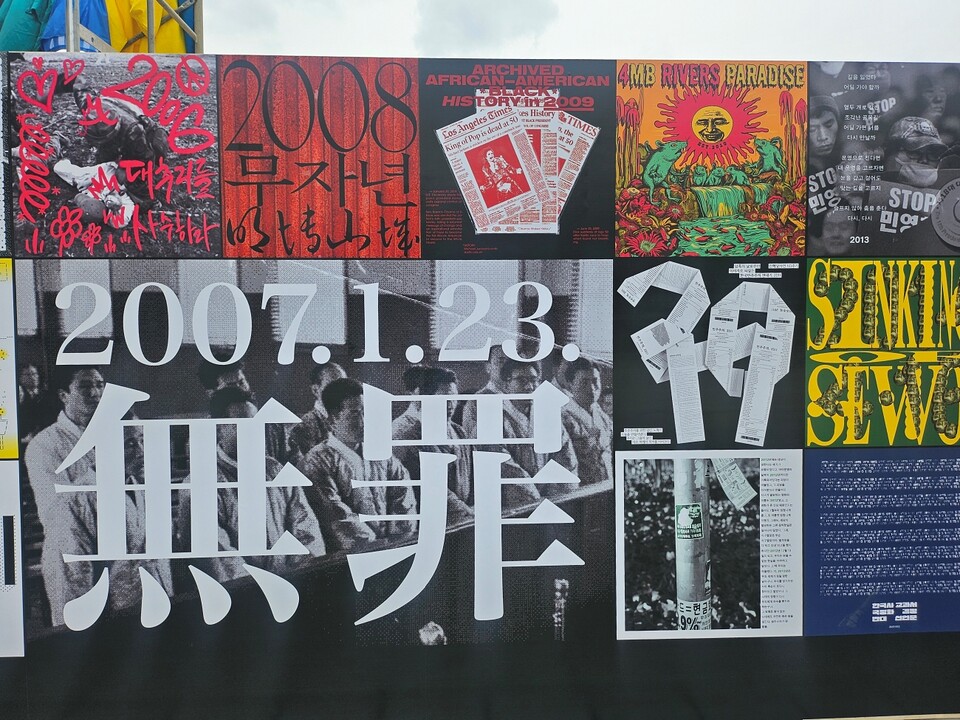 '無罪(무죄)'라고 적힌 커다란 전시 작품. 50년 전 억울한 누명을 쓰고 희생된 인혁당 희생자들의 아픈 역사를 보여준다. 가장 많은 이들의 눈길을 끌었다. 당시 인혁당 희생자들은 긴급조치 1~4호, 국가보안법 위반 등으로 유죄를 인정 받아 감옥에 갇혔다. 대법원에서 사형 선고를 내린지 18시간 만에 사형이 집행돼 목숨을 잃었다. 50년 전 당시 사건을 담은 신문 보도들도 이날 전시회 곳곳에 배치됐다.