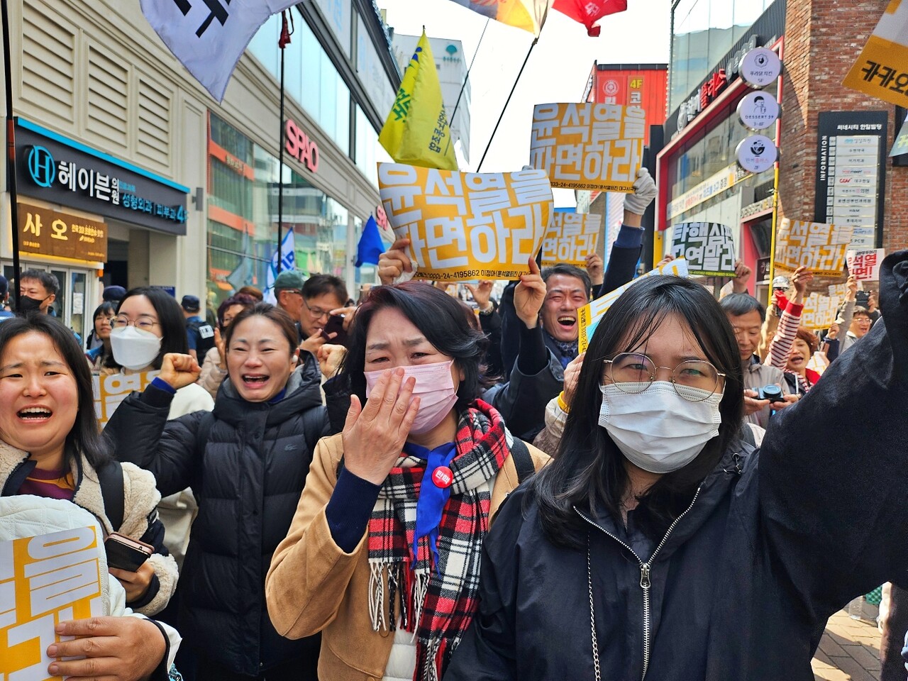 지난 2016년 '박근혜 국정농단' 촛불 이후 8년 만에 시민들은 다시 거리로 나왔다. 촛불 대신 아이돌 응원봉을 손에 쥐고, 손수 만든 피켓을 들며 "윤석열 탄핵" 목소리를 높였다. 동성로 광장에 모인 시민들은 민주화 운동의 상징적인 곡 '광야에서', '아침이슬'과 삼성 라이온즈 응원가 '엘도라도', 소녀시대의 '다시 만난 세계'를 함께 부르며 민주주의를 외쳤다.
