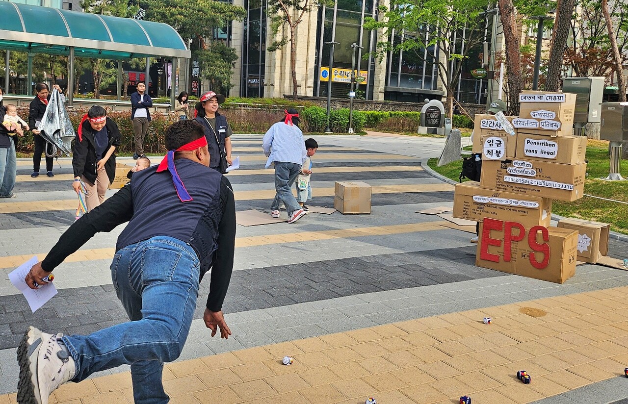 이 같은 문제를 해결하기 위해 집회 장소 한 켠에는 캄보디아어, 인도네시아어, 미얀마어, 베트남어, 우즈베크어, 스리랑카어 등 9개 언어로 적힌 '이주노동자 권리 수첩'이 놓였다. 임금체불 대응이나 사업장 이동 방법 등 노동자들이 알아야 하는 기본적인 노동법들에 대한 설명이 담겼다. 또 이주노동자들이 문제라고 생각하는 정책을 놀이로서 푼 코너도 마련됐다. '사업장 변경의 제한', '인간사냥', '임금체불' 등을 적어 오재미를 던지며 "차별 철폐"를 촉구했다.