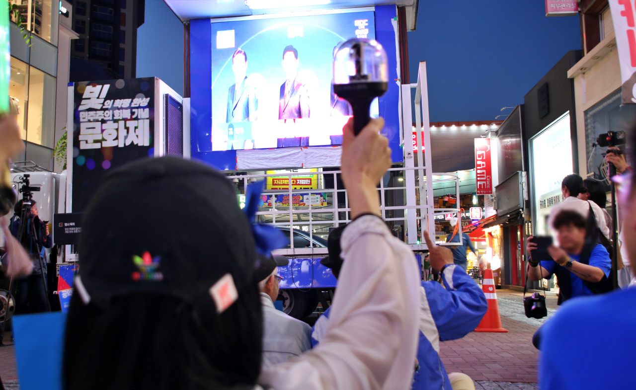 대구 동성로 광장에 모인 시민들도 환호했다. 비상계엄 사태로 촉발된 제21대 대선. 계엄을 종식시킨 빛의 혁명을 이끈 응원봉 시민들은 이재명 후보 예측 1위 결과에 환호하며 기뻐했다.