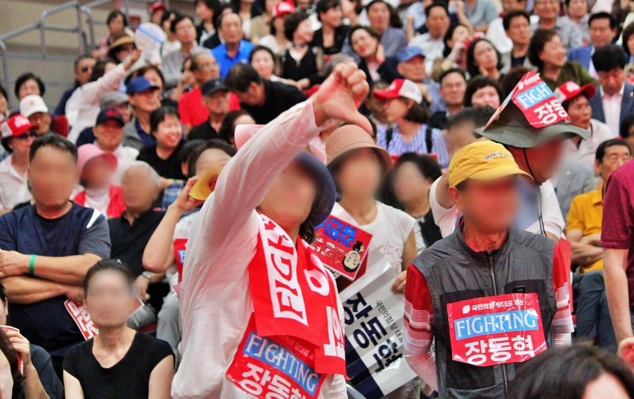 당 대표 연설에서 후보들이 연단에 올라 정견 발표를 할 때마다 "배신자"라는 고성이 터져 나왔다. 탄핵 찬성파로 분류되는 안철수·조경태 후보와 탄핵 반대파인 김문수·장동혁 후보 지지자들 간 신경전이 펼쳐졌다.
